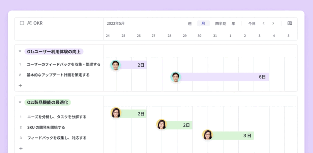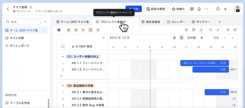 その他にもガントビューやカレンダービューなどがあるため、用途や目的に合わせたプロジェクトの管理方法がより直観的に把握可能となります。