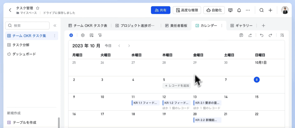 | カレンダービュー | 日付情報をカレンダーで可視化 |
