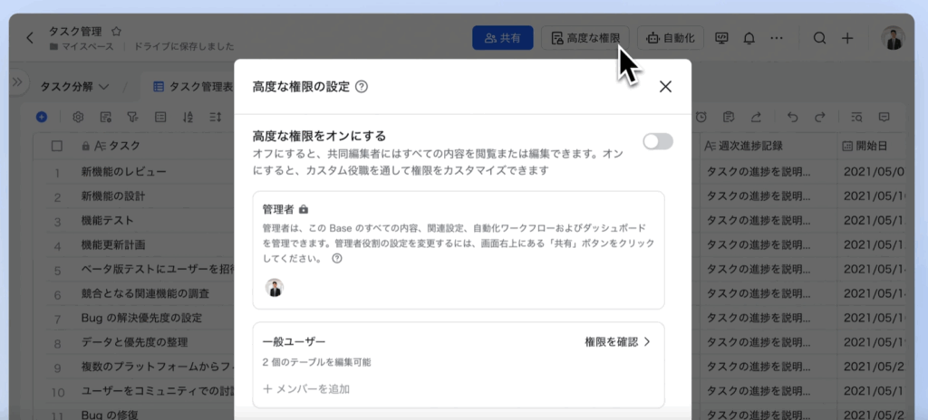Baseでは、同じデータベースに対して、メンバーごとに異なる権限を設定できます。
